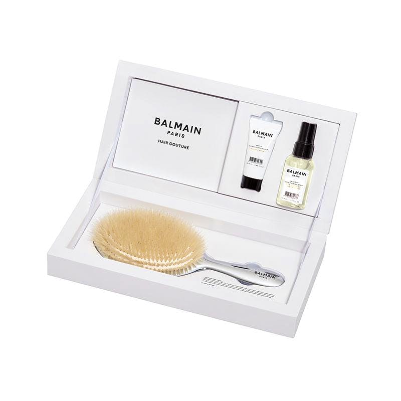 Silver Boar Hair Spa Brush Set fra Balmain er en eksklusiv hårpleieserie som tar hårstellet ditt til et nytt nivå. Denne elegante samlingen inneholder en sølvfarget villsvinbørste, kjent for sin evne til å skånsomt løsne floker og glatte ut håret samtidig som den fremhever hårets naturlige glans. I tillegg til børsten får du to essensielle hårpleieprodukter: en leave-in balsamspray som gir næring og beskyttelse til håret, samt en arganolje-eliksir som gir en silkemyk finish og fornyer håret med sine rike, fuktighetsgivende egenskaper.