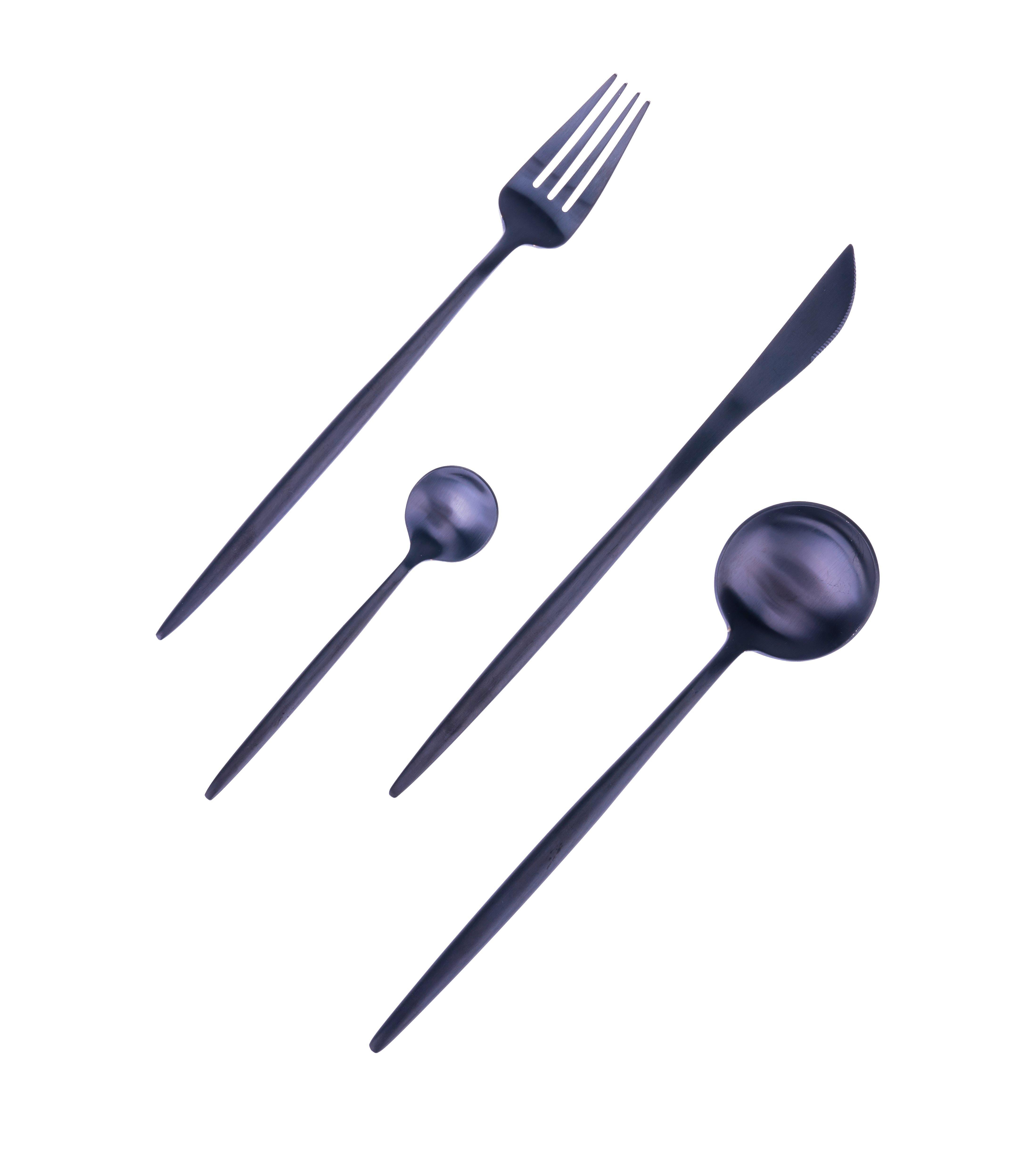 Gi dette borddekselet nytt liv med dette svarte bestikket. Bestikket er veldig fint og akkurat nå er det topp moderne med bestikk i andre farger enn bare sølv. Settet inneholder kniv, gaffel, servise og teskje. Settet inneholder 4 deler.