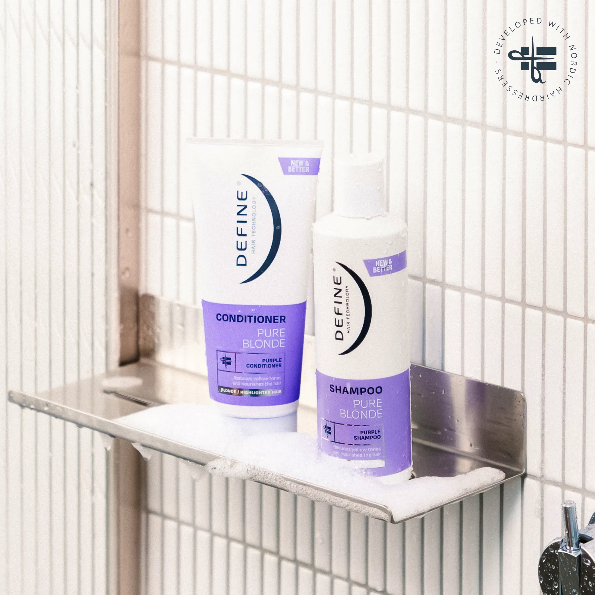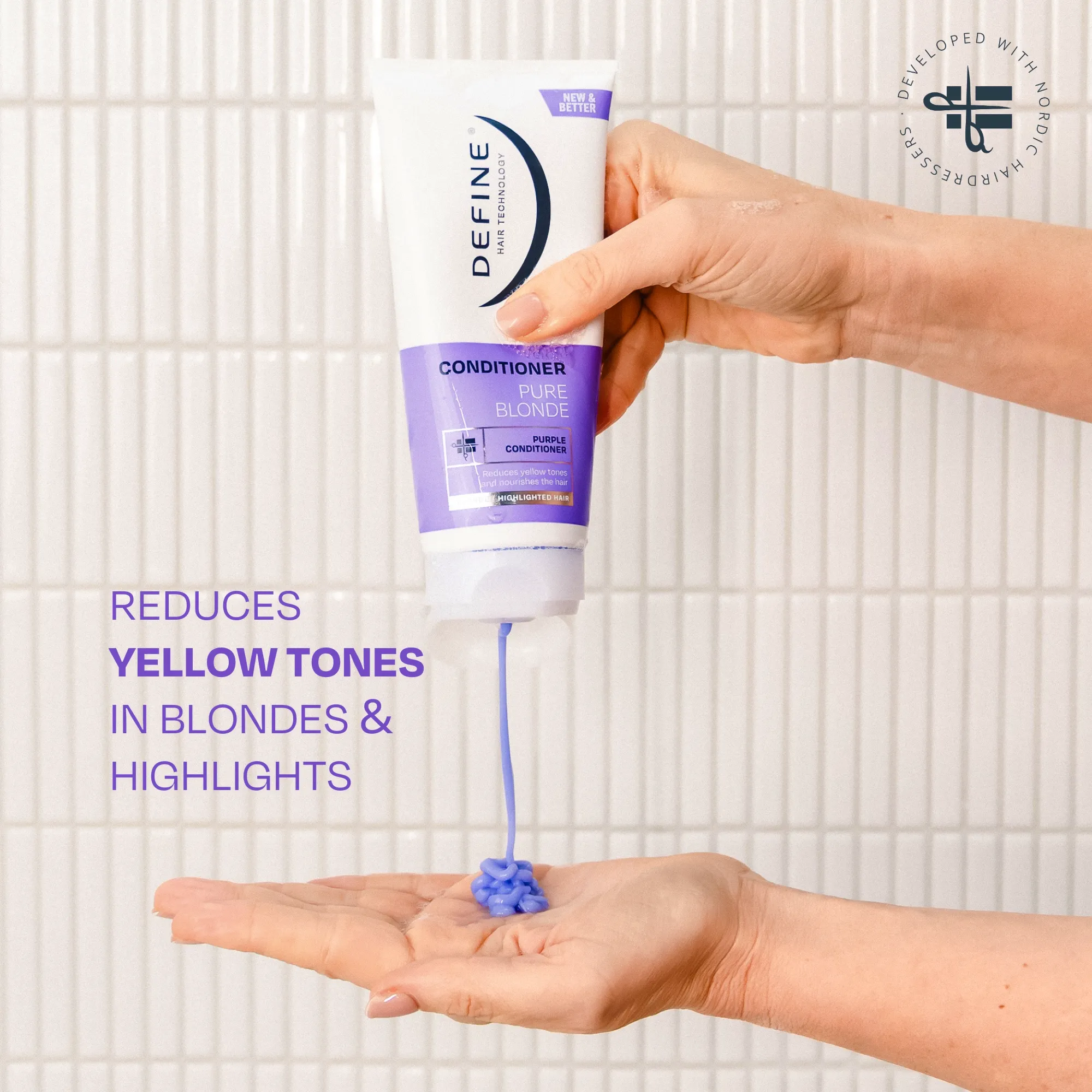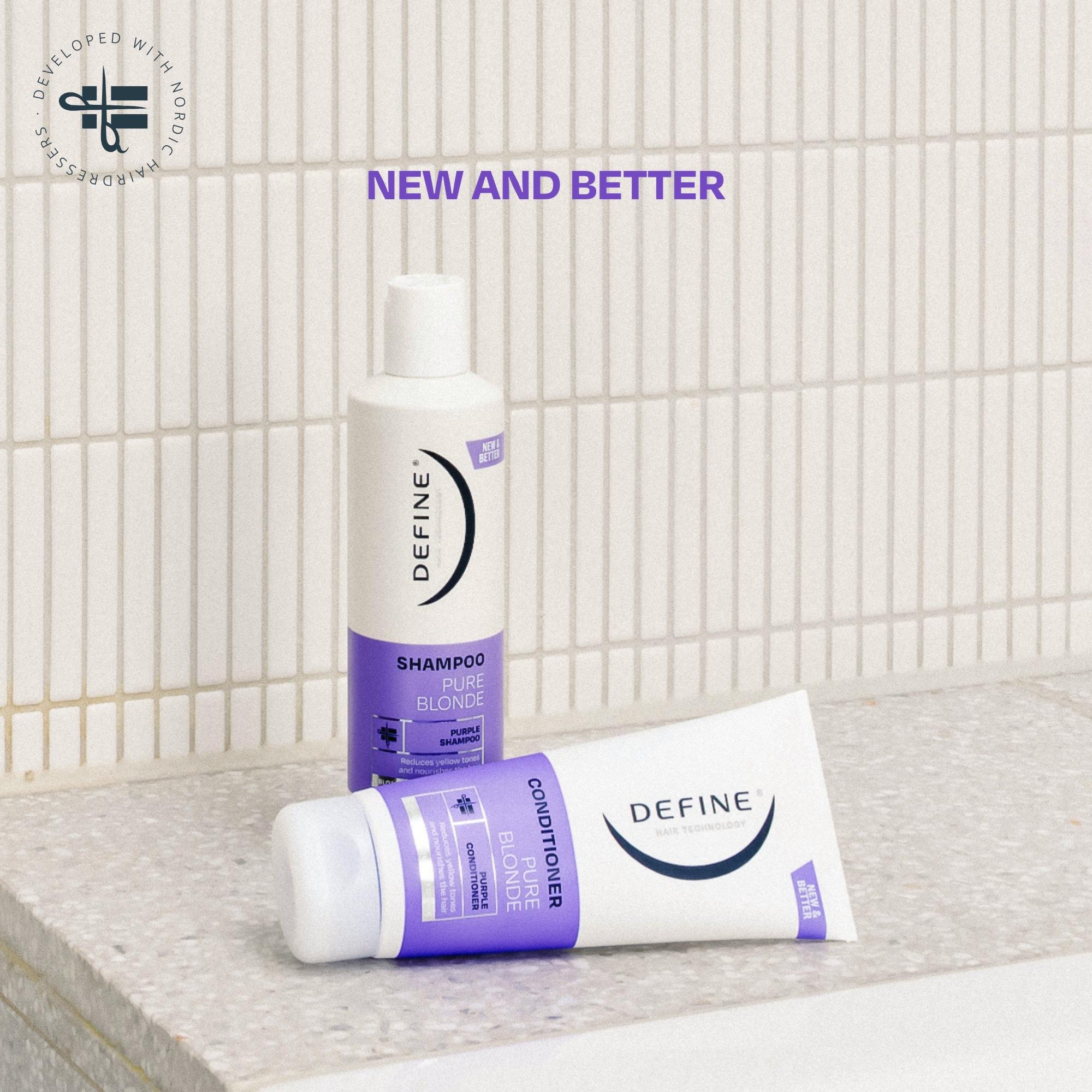 Define Pure Blonde Balsam inneholder lilla fargepigmenter som demper uønsket gulskjær i håret og gir en friskere farge.