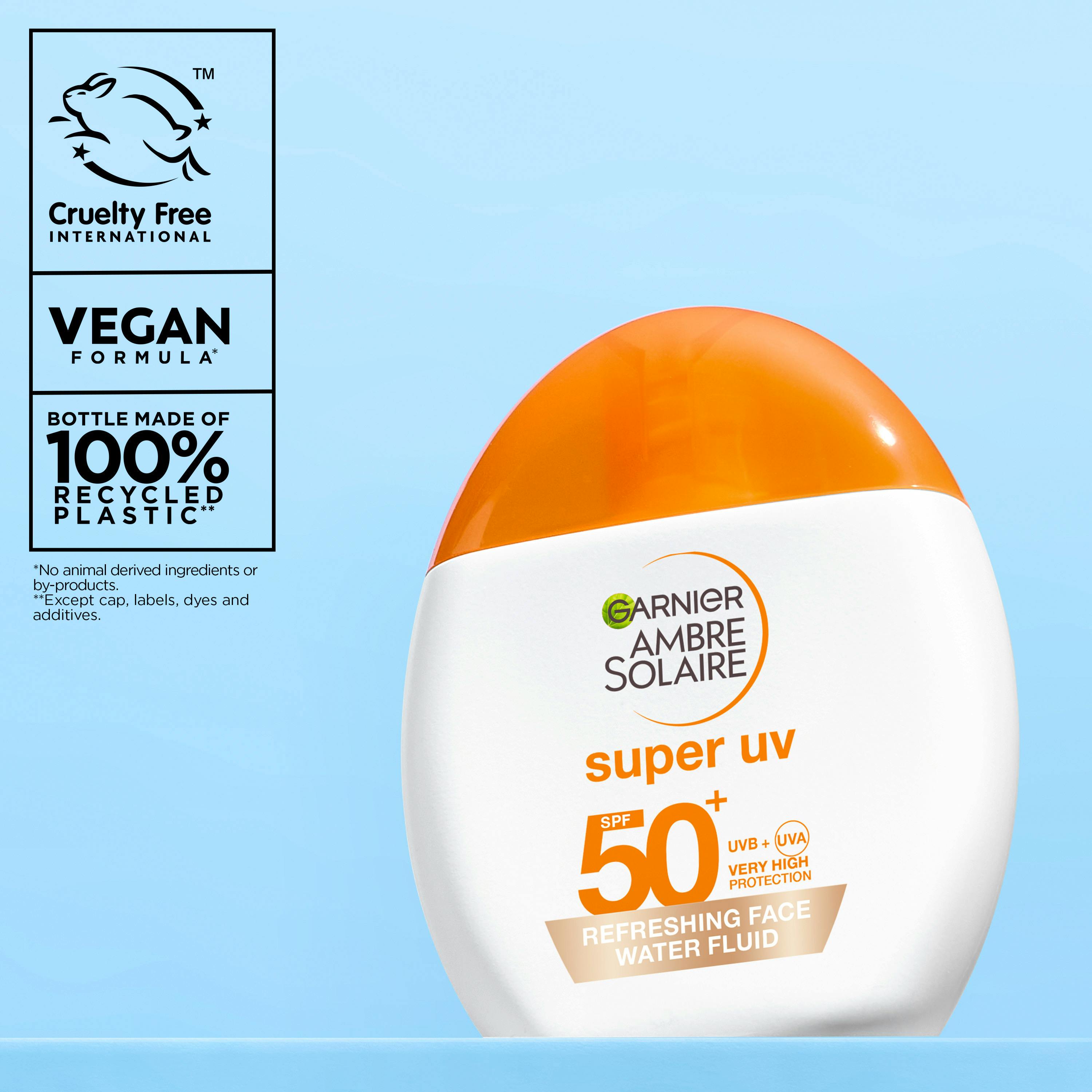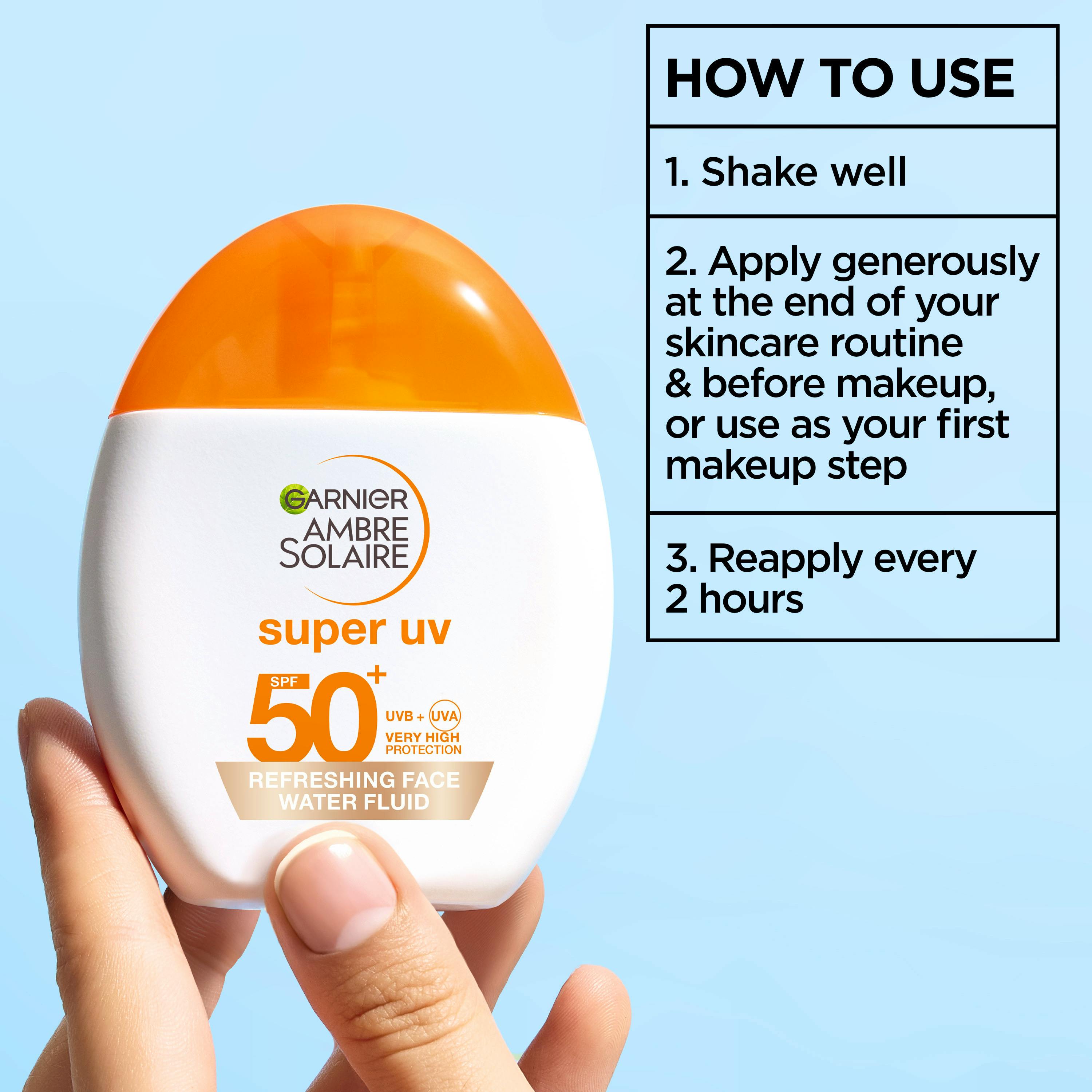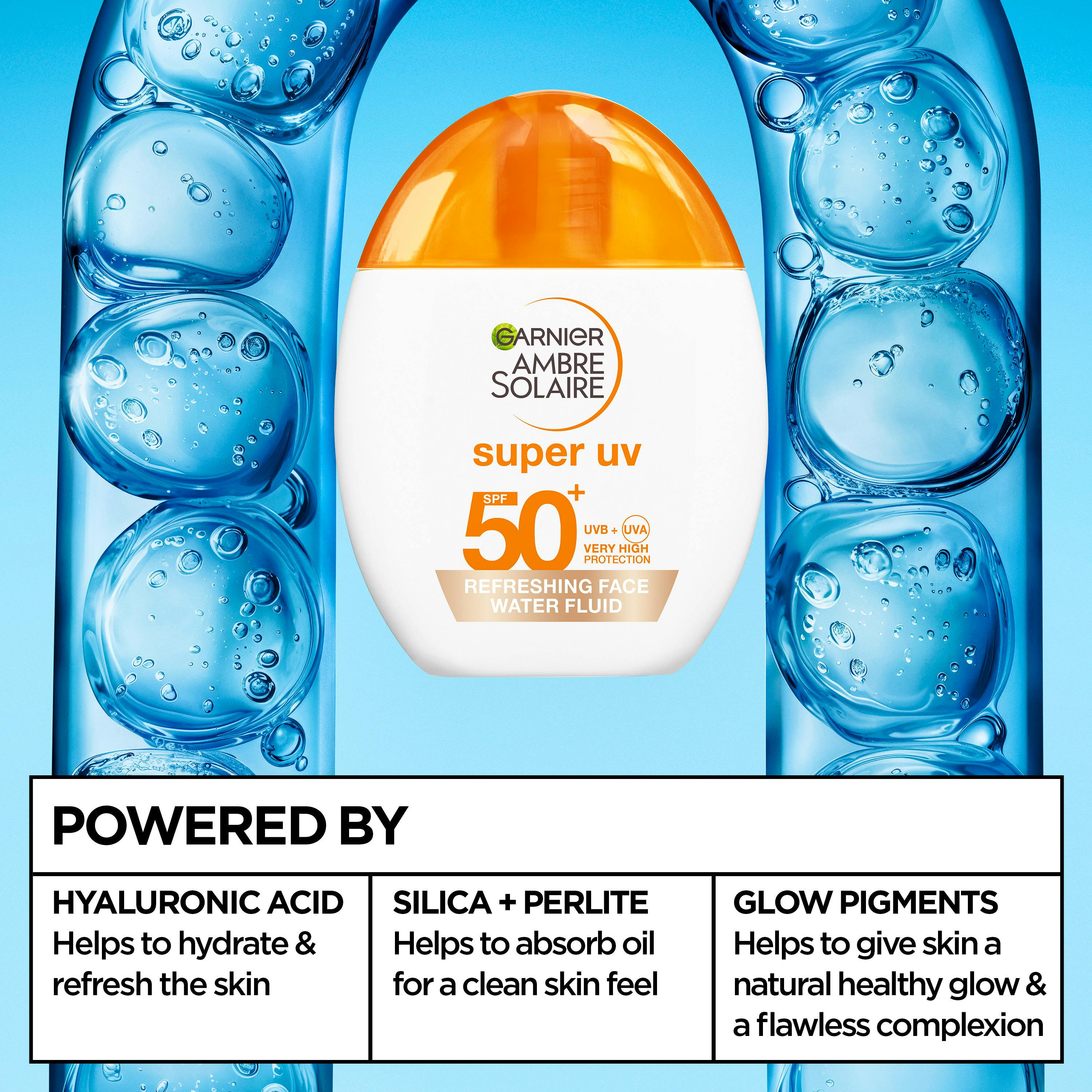 Garnier Ambre Solaire Super UV Refreshing Face Water Fluid SPF 50+ er en parfymefri solkrem til ansikt og øyeparti. Produktet passer for deg som ønsker daglig høy solbeskyttelse med en lett oppfriskende*** følelse. Konsistensen er lett og frisk og føles ikke klissete på huden. Lett farget formel som gir flott glød og en feilfri look****.