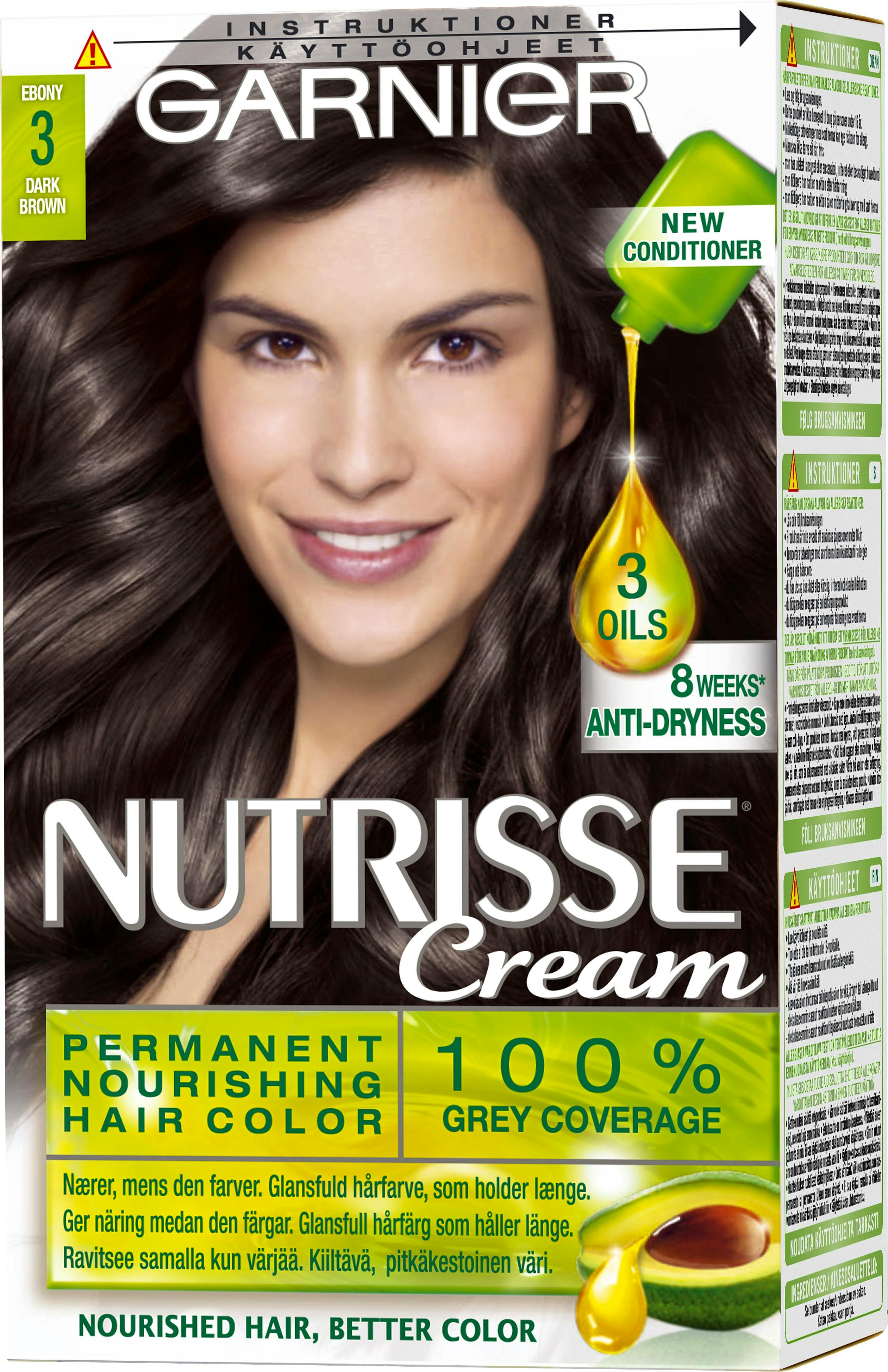 Garnier Nutrisse Creme 3 Ebony Dark Brown er en permanent hårfarge med god dekkeevne i en flott mørkebrun tone.