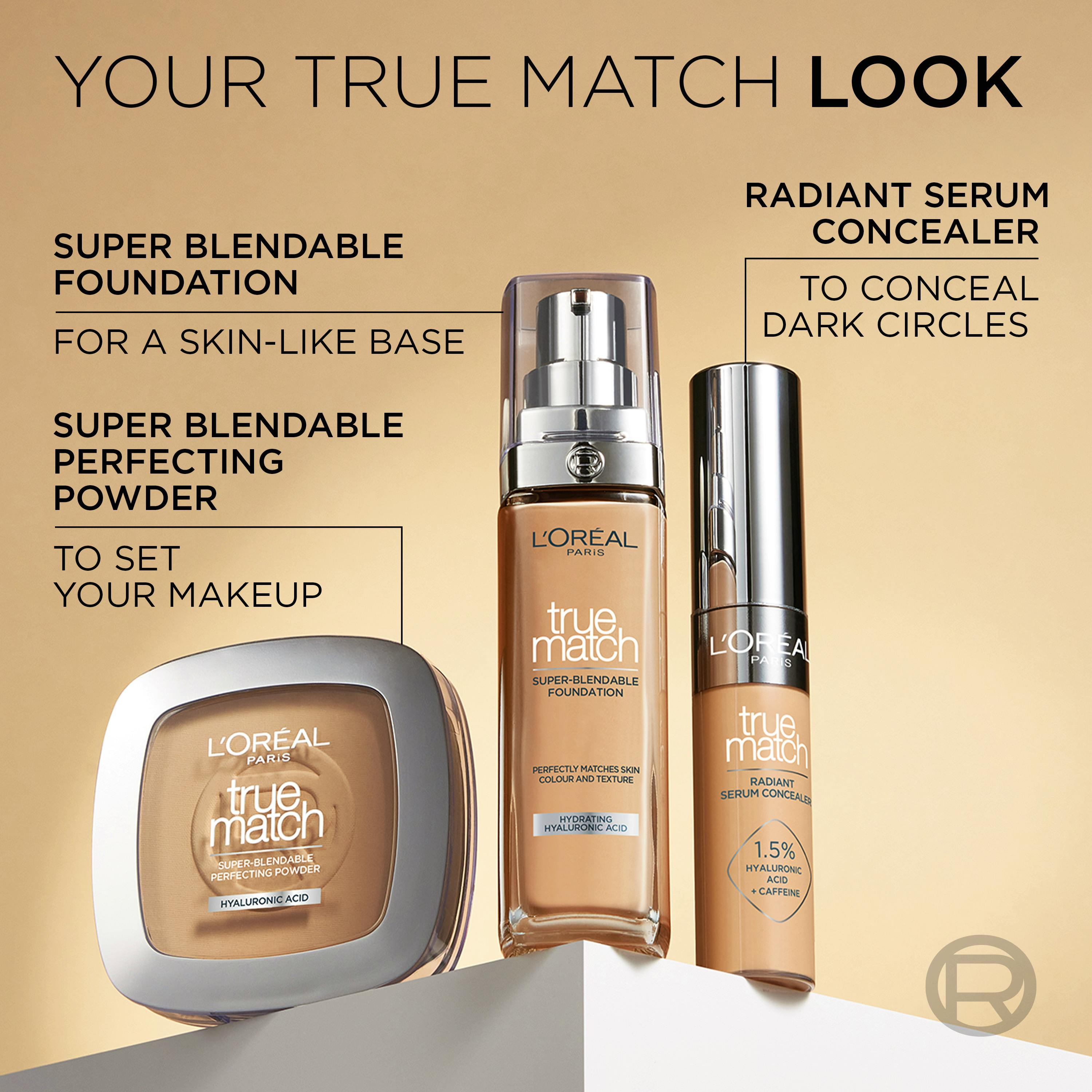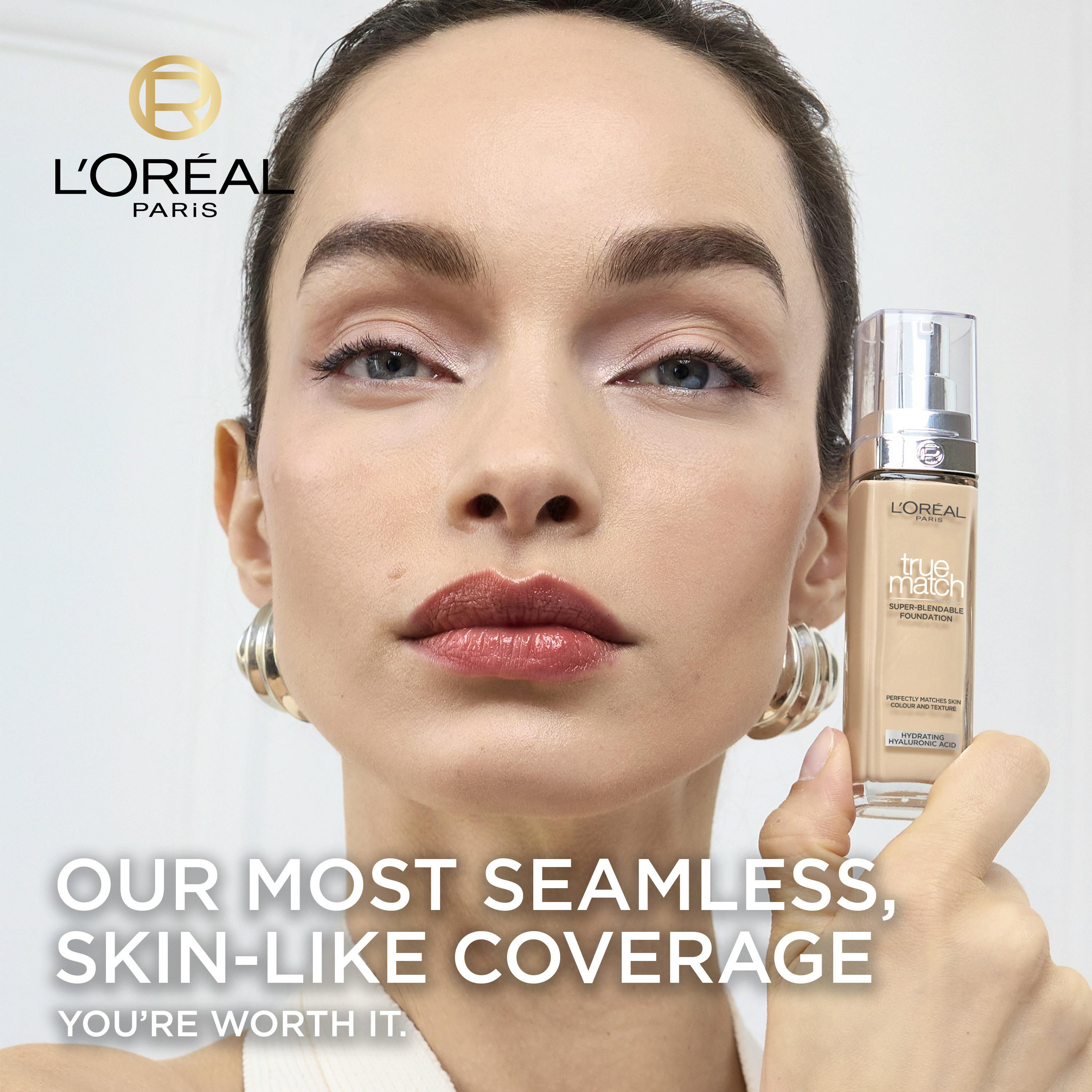 Finn din perfekte match med L'Oréal Paris True Match Super-blendable foundation. Formelen er superenkel å tone ut og tilpasser seg perfekt til hudtonen for å gi en plettfri look som ser naturlig ut. Den lette konsistensen gir lett dekning uten at huden ser pudderaktig ut eller at formelen kaker seg. Formelen består av en fuktighetsgivende base beriket med hyaluronsyre for 24 timers fukt*.