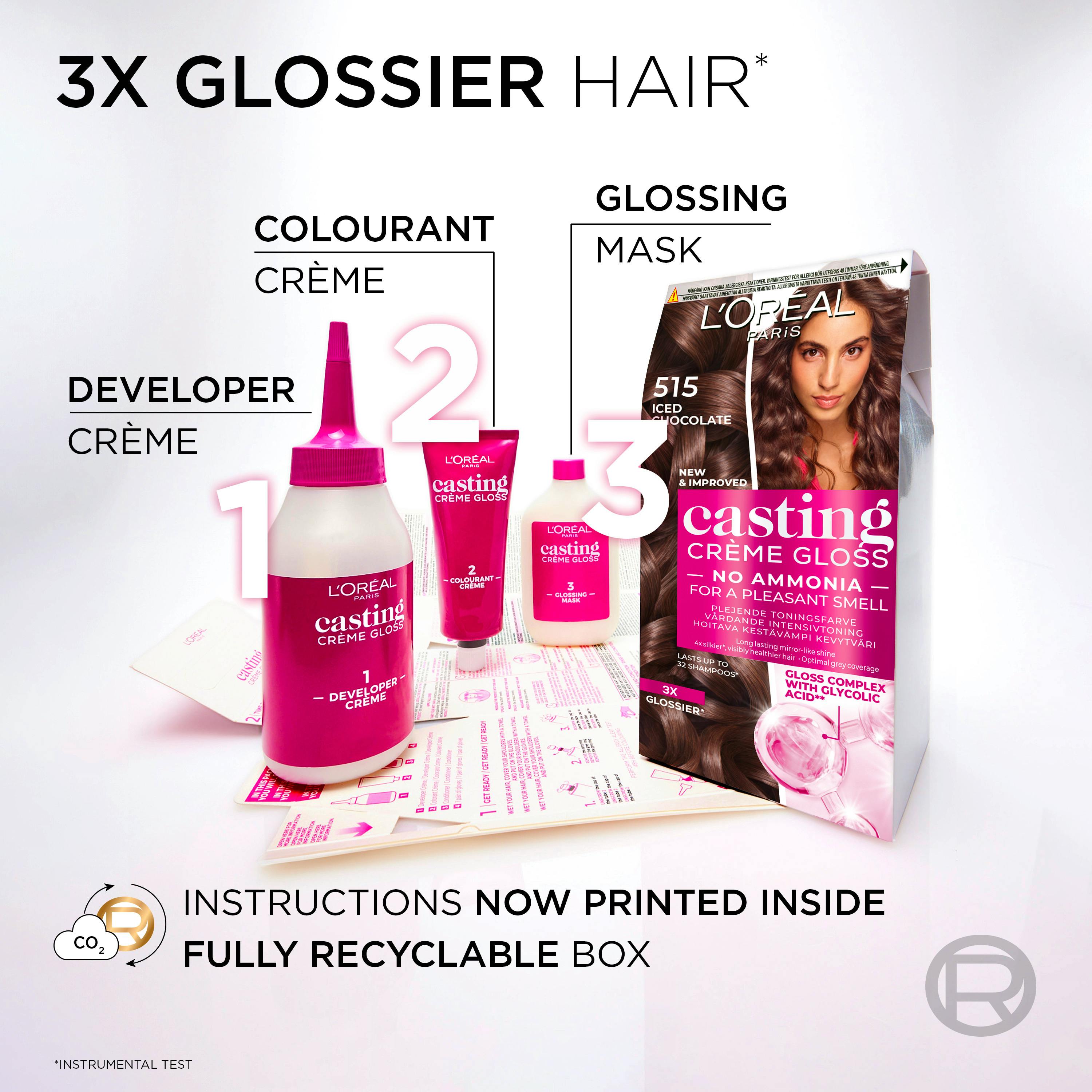 Casting Crème Gloss passer perfekt for deg som vil forsterke din naturlige hårfarge med reflekser, og gi håret ditt ny glans. En pleiende toning som holder i 6-8 uker. • Gir glød til den naturlige hårfargen din. • Naturlig glansfull farge med synlige reflekser. • Pleiende, helt uten ammoniakk. • Lysner ufarget hår 1 tone. • Dekker grått hår opptil 70 %. • Pleiende toning som varer ca. 6-8 uker. For ekstra pleie til farget hår: