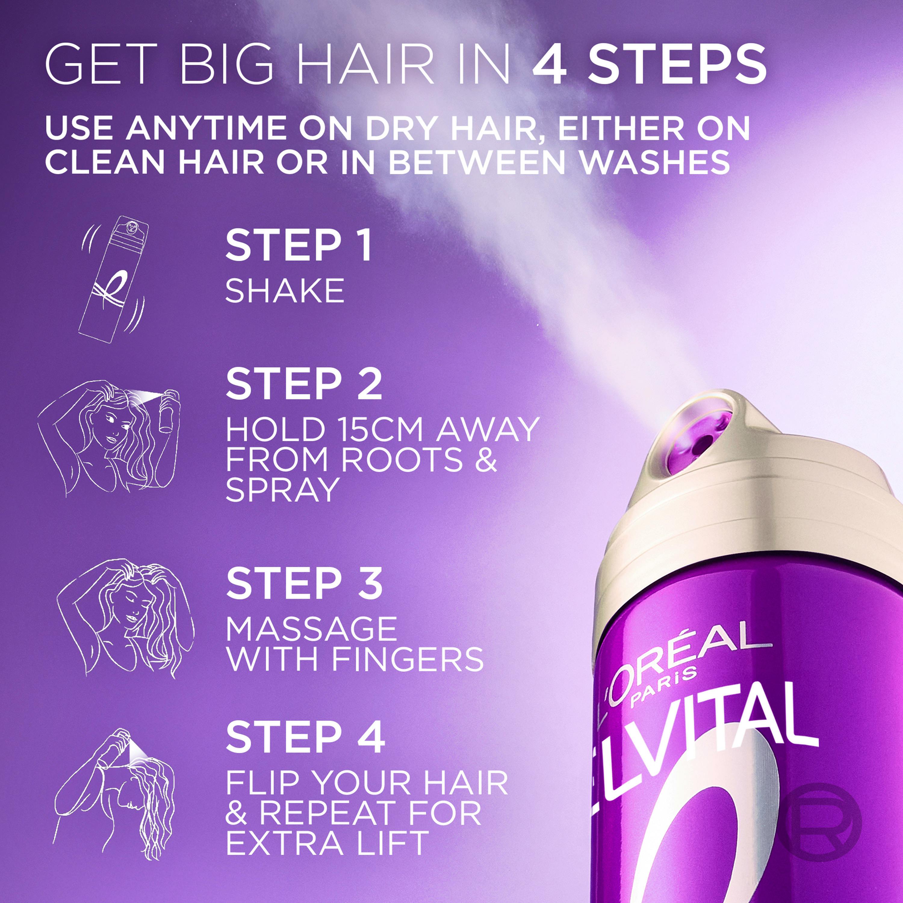 Brukes i tørt, rent hår mellom hårvasker, ved behov Rist flasken før bruk. Spray på hårrøttene fra ca. 15 cm avstand. Masser inn for å skape volum. For ekstra volum, snu hodet opp ned og spray en gang til på hårrøttene.
