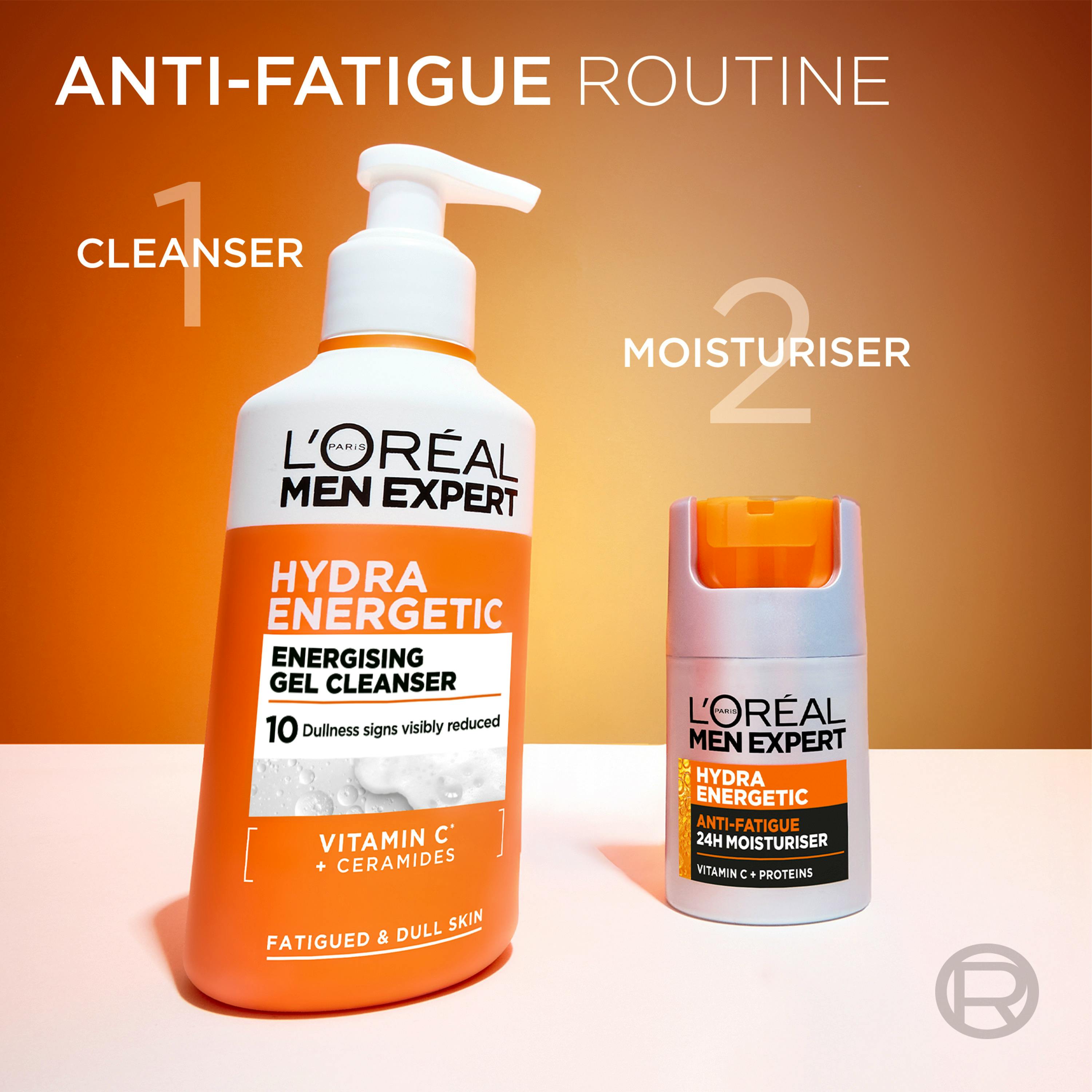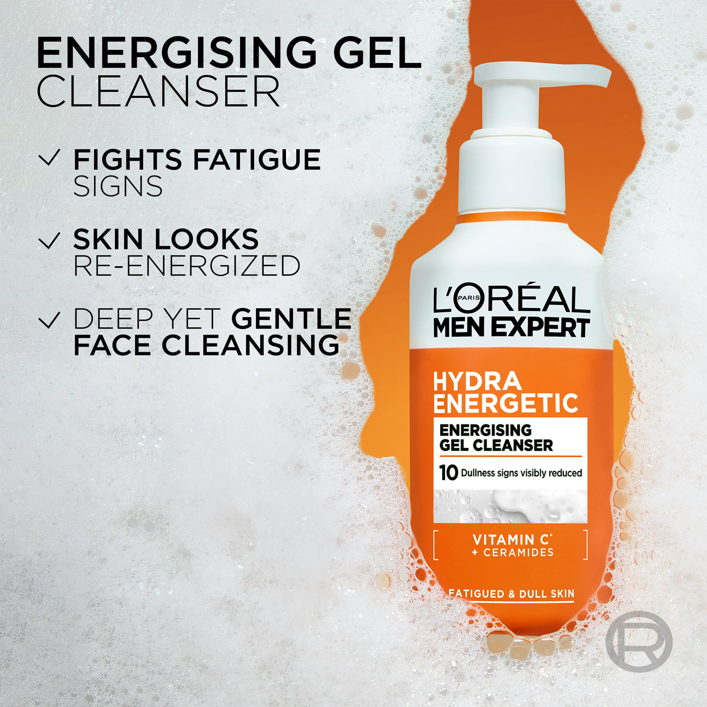 L'Oréal Paris Men Expert Hydra Energetic Gel Cleanser er en oppfriskende og skånsom rensegelé til menn. Den lett skummende formelen virker ved å redusere 10 tegn på gusten hud og har en gunstig effekt på matt hud, ujevn hudtone, tørrhet, tilstoppede porer, tap av spens, ujevn hudtekstur, døde hudceller, mangel op glød og trøtthetstegn.
