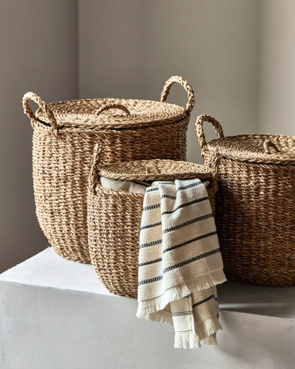 Perfekt til oppbevaring av småting, leker eller tekstiler i stue, bad eller gang. Lokkene skjuler innholdet og gir et ryddig uttrykk, mens det håndflettede sjøgresset bringer inn en varm og lun stemning. Bruk dem samlet for en harmonisk stil eller hver for seg der du trenger dem mest. - Naturlig sjøgressmateriale