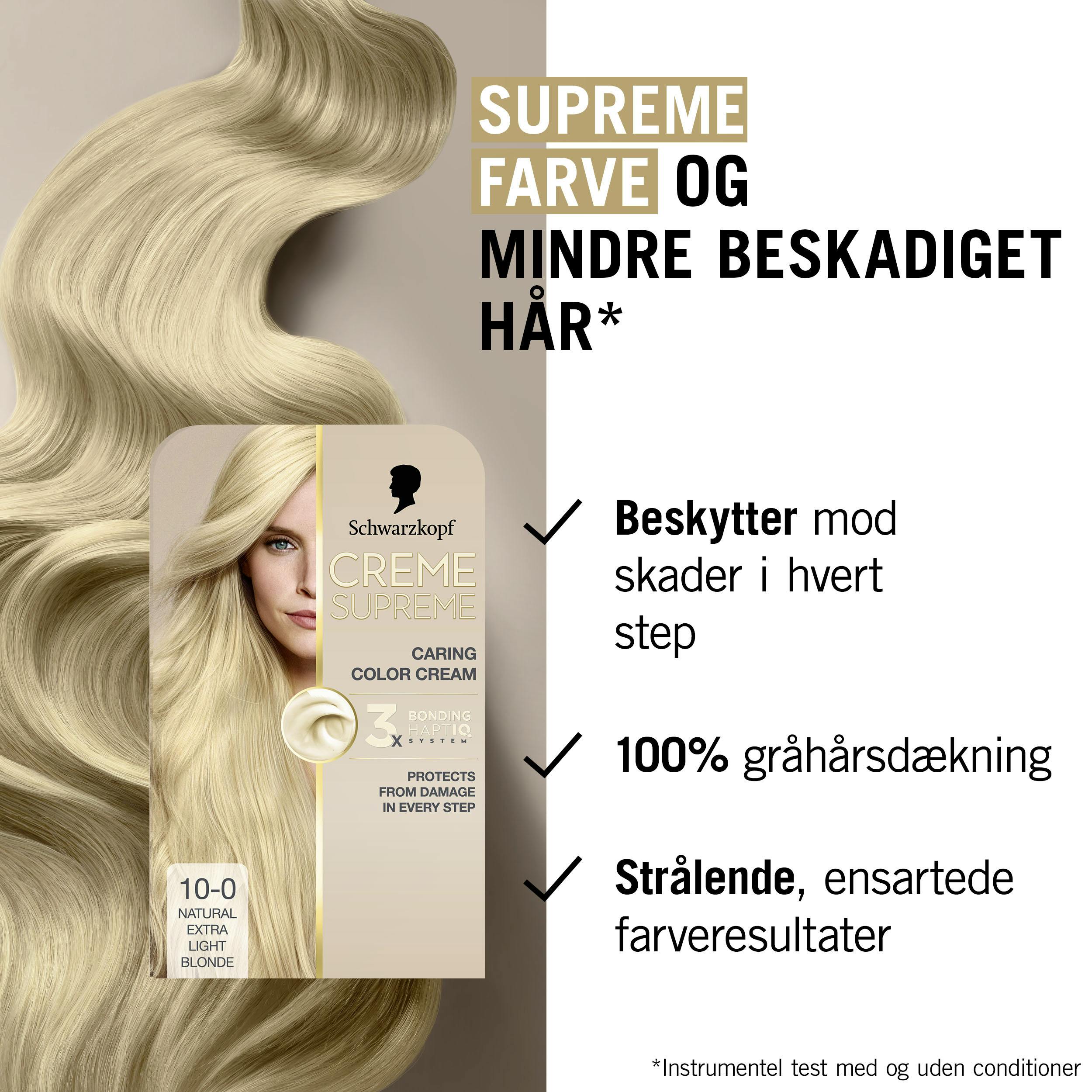 Schwarzkopf Creme Supreme 10-0 Natural Extra Light Blonde er en permanent hårfarge som gir en fantastisk, naturlig blond nyanse samtidig som den gir fremragende pleie til håret ditt. Produktet er utviklet med det avanserte 3x Bonding HAPTIQ-systemet, som forbereder, beskytter og styrker håret under fargeprosessen. Formelen sikrer et vakkert og jevnt fargeresultat, perfekt for de som ønsker en naturlig ekstra lys blond look. En Blue Bonding hårbehandling er inkludert for å nøytralisere uønskede gule toner, slik at håret ditt får et friskt og livlig utseende.
