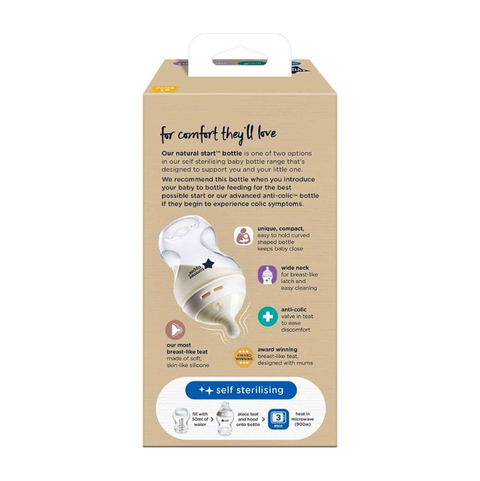 Natural Start Baby Bottle fra Tommee Tippee er utviklet for å gjøre overgangen fra amming til flaskemating så smidig som mulig. Denne tåteflasken er nøye utformet for å etterligne den naturlige fleksibiliteten, strekkbarheten og bevegelsen til en mors bryst, noe som gjør den til et ideelt valg for nyfødte og spedbarn. Flaskens ergonomiske form gir et komfortabelt grep for både foreldre og barn, mens den antikolikkventilen bidrar til å redusere luftinntak, noe som forebygger ubehag og gir en mer behagelig mateopplevelse.